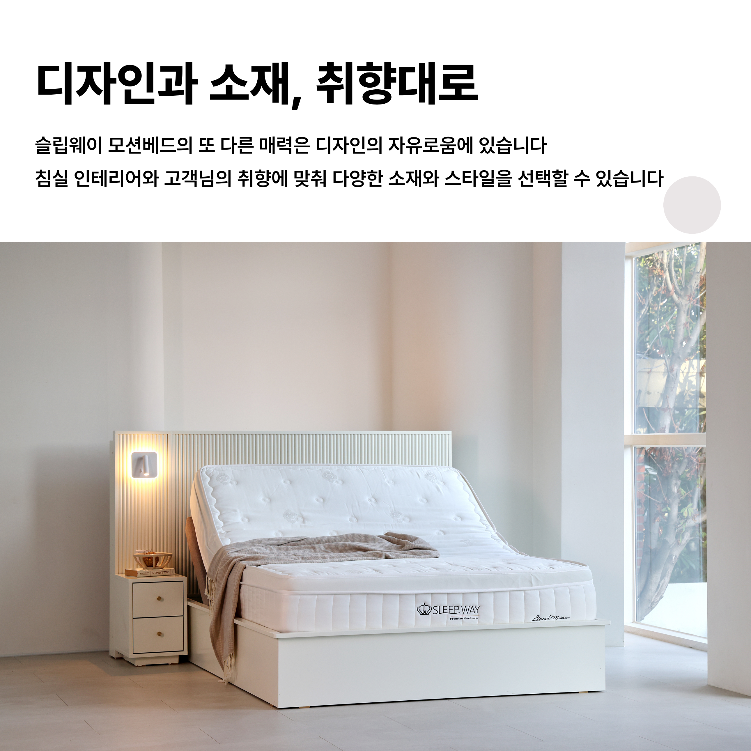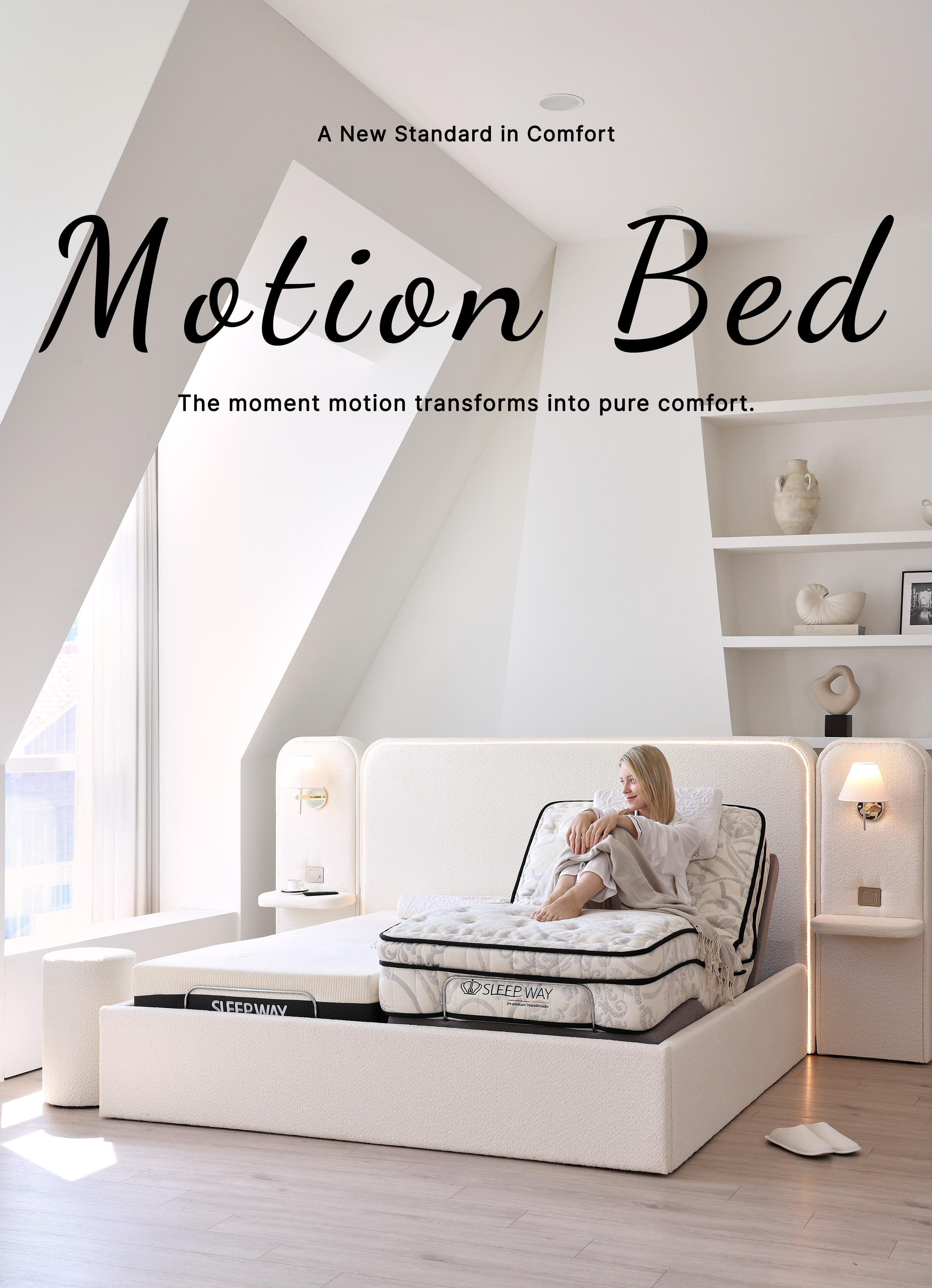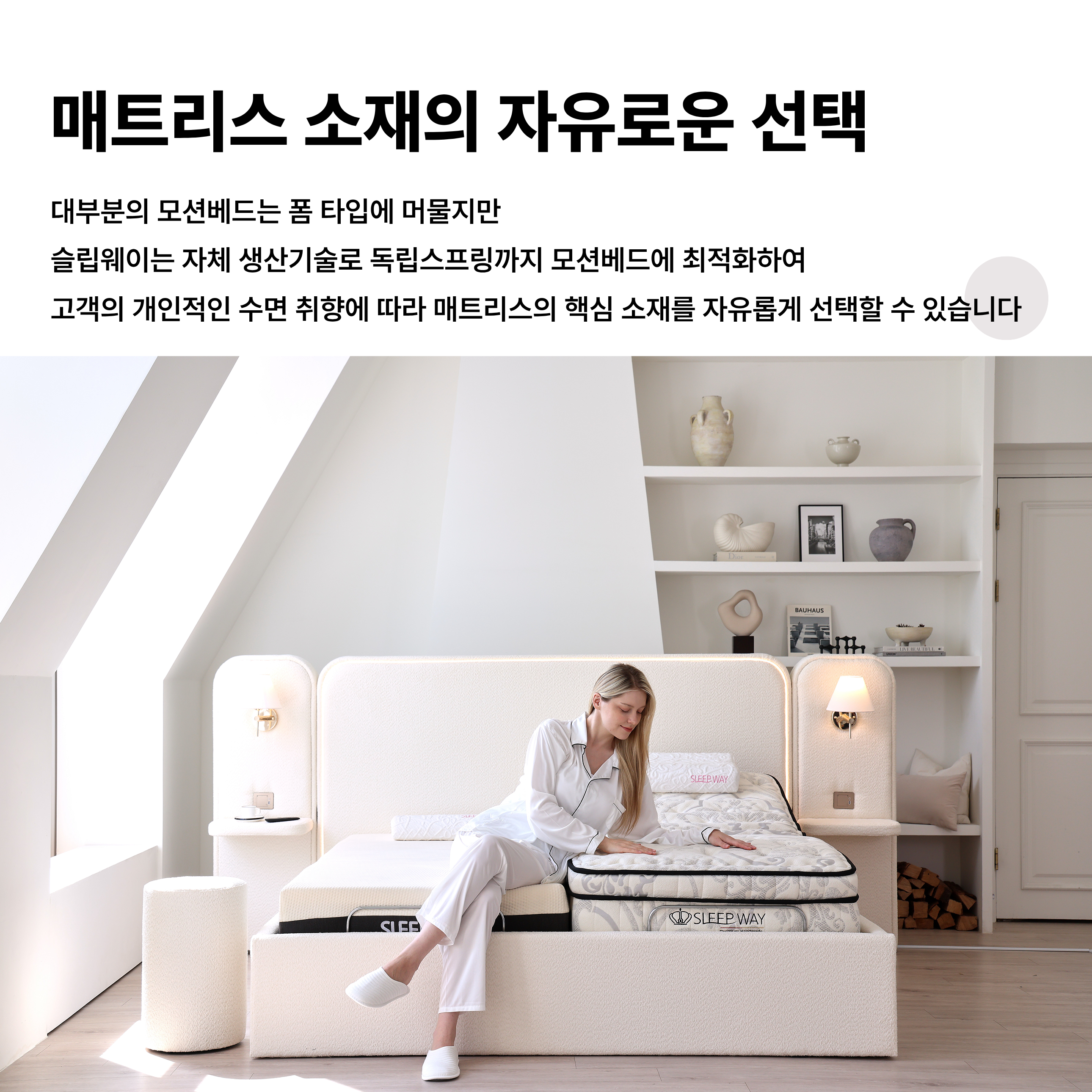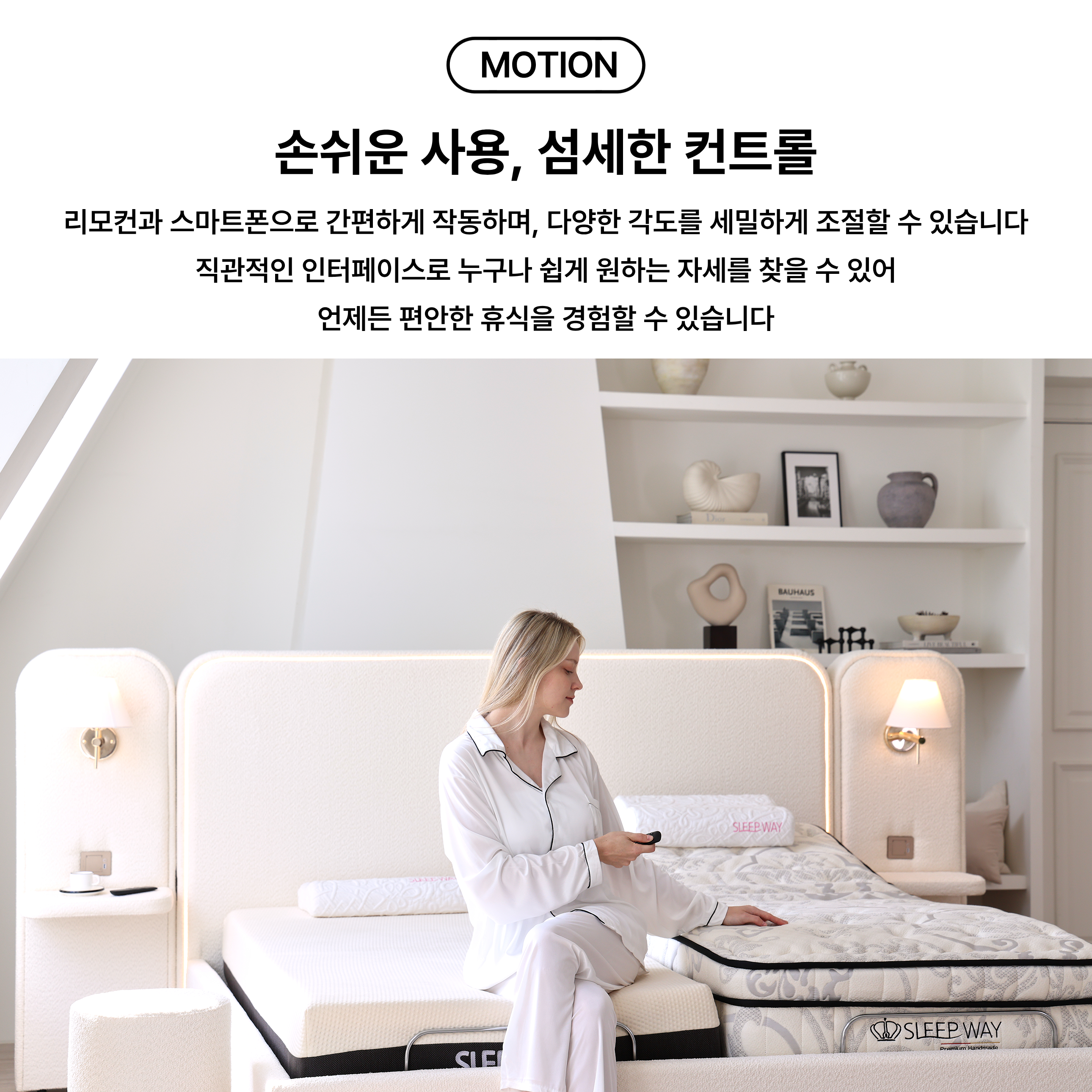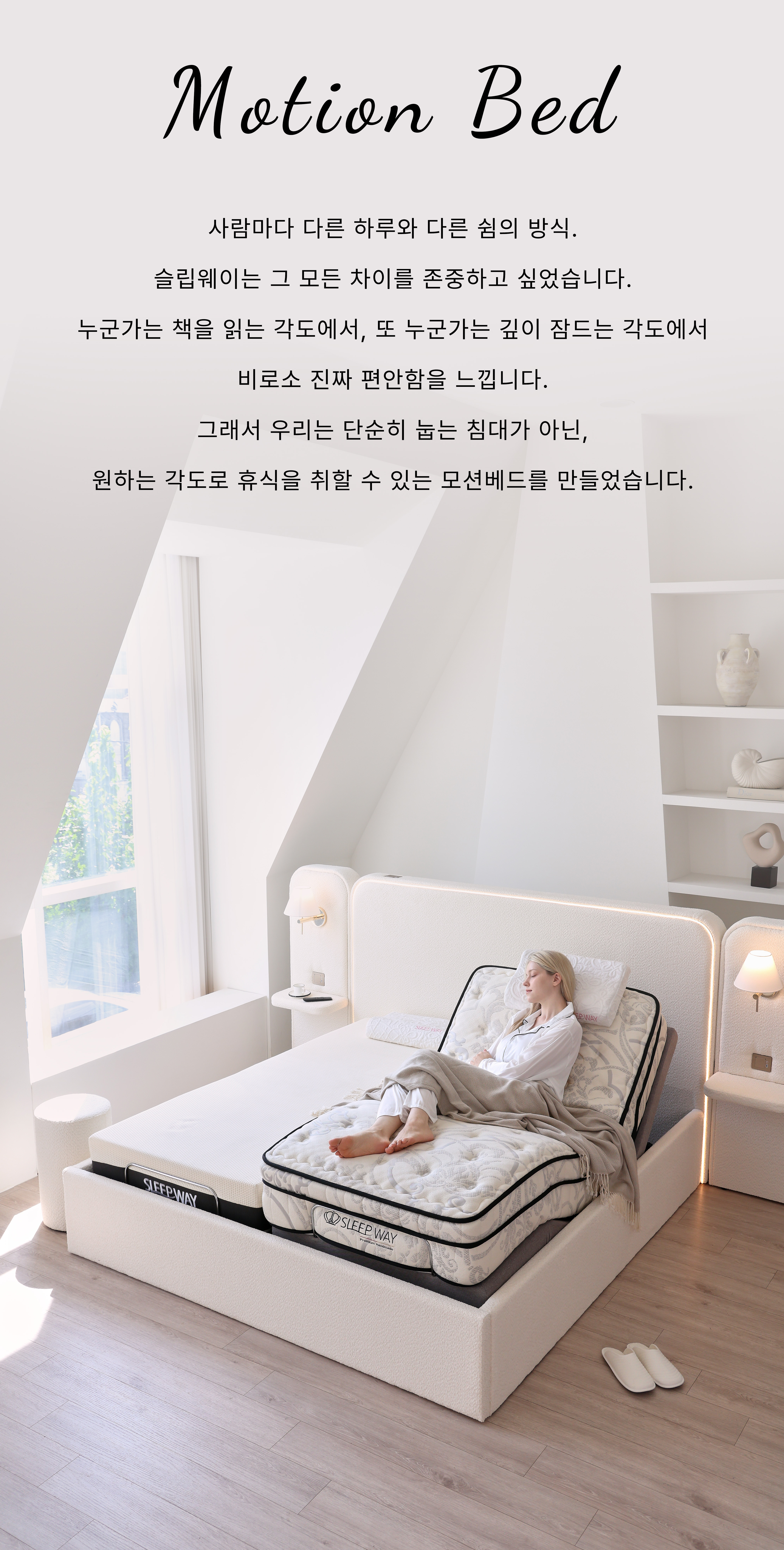 슬립웨이 모션베드는 원하는 각도로 자유롭게 조절해 맞춤형 휴식을 제공하는 프리미엄 베드입니다. 독일 OKIN社의 안정적인 모션 기계와 정밀 가공된 고탄성 베이스폼을 적용해 부드럽고 조용한 구동을 실현하며, 고객의 취향에 따라 독립스프링 또는 메모리폼 타입을 선택할 수 있습니다