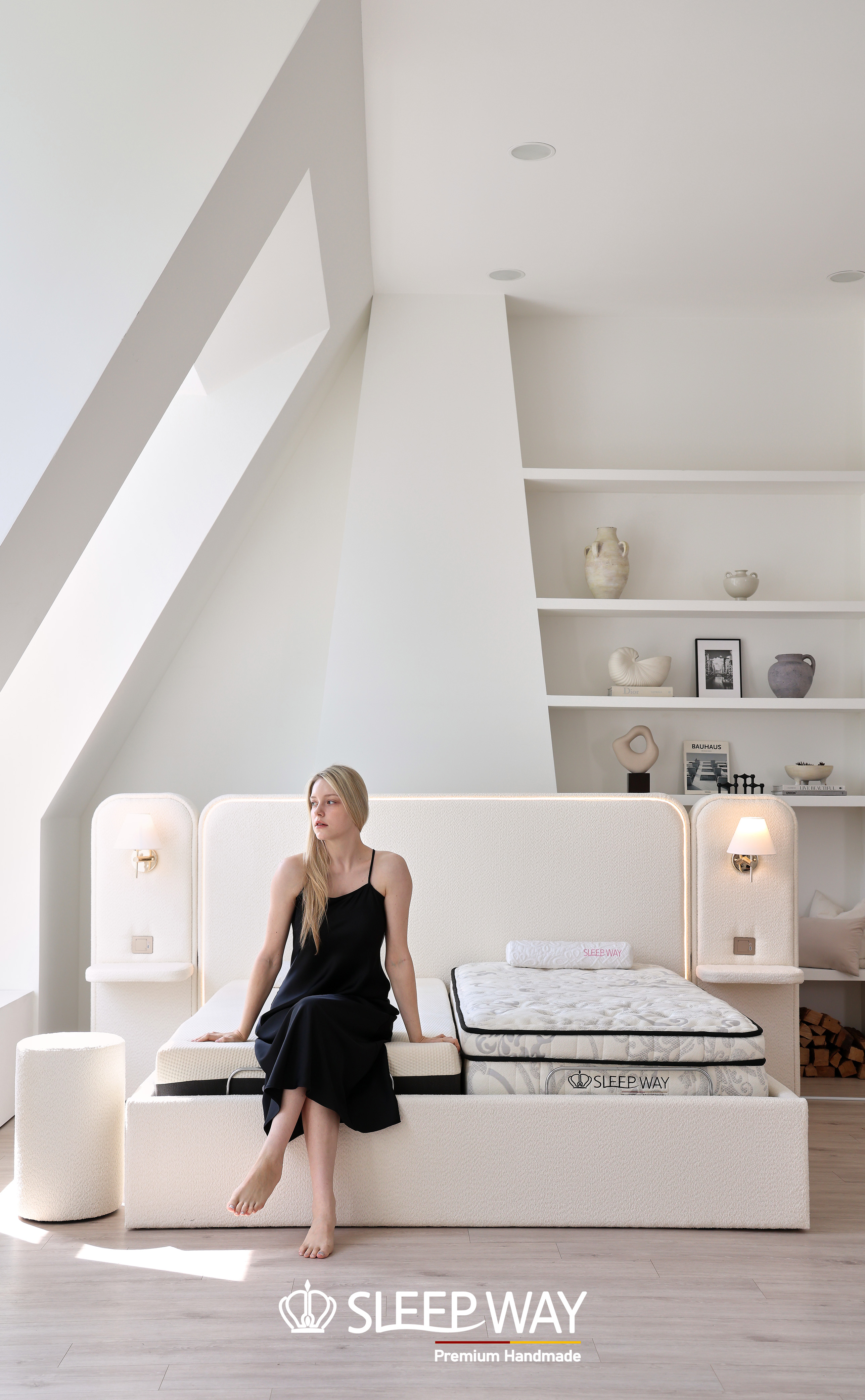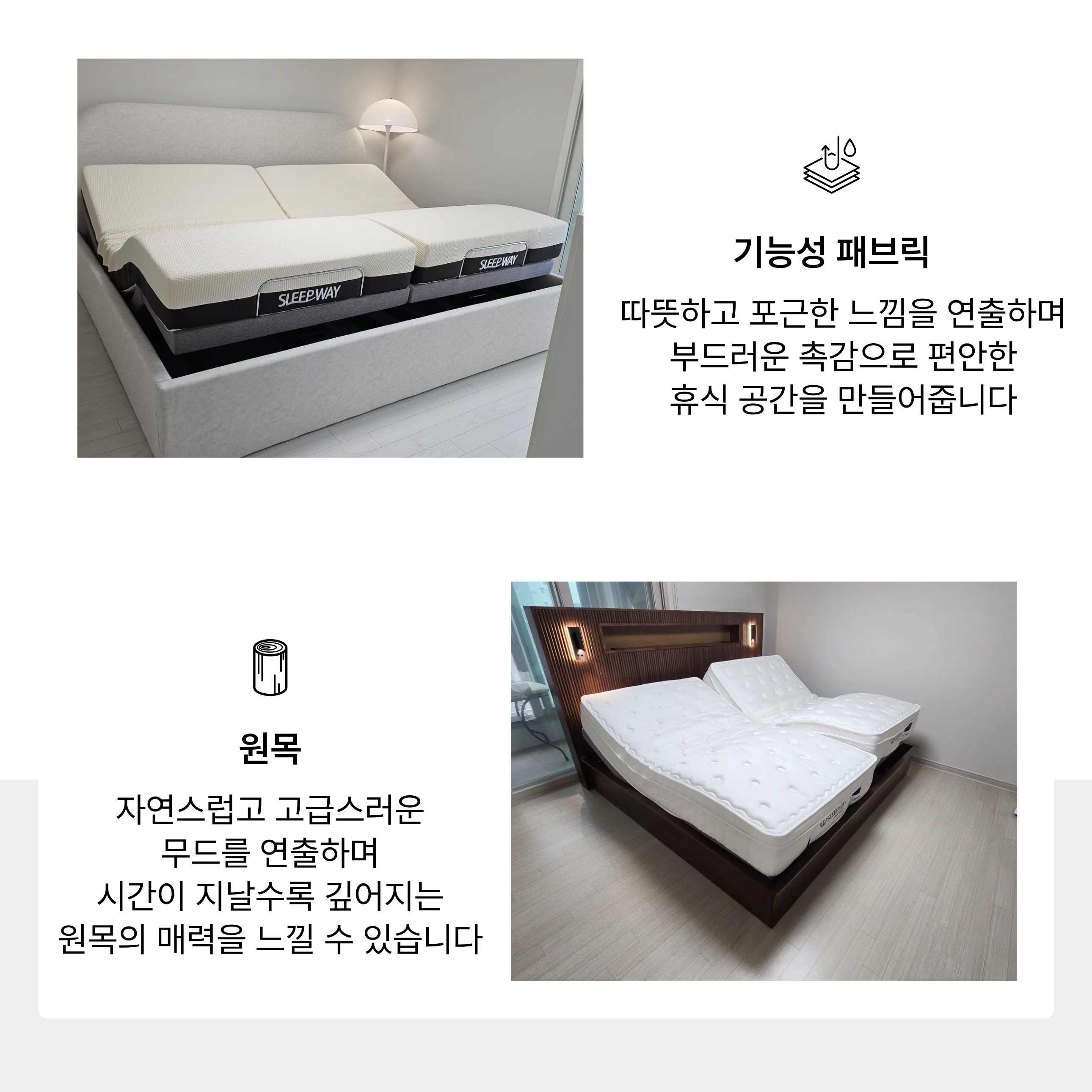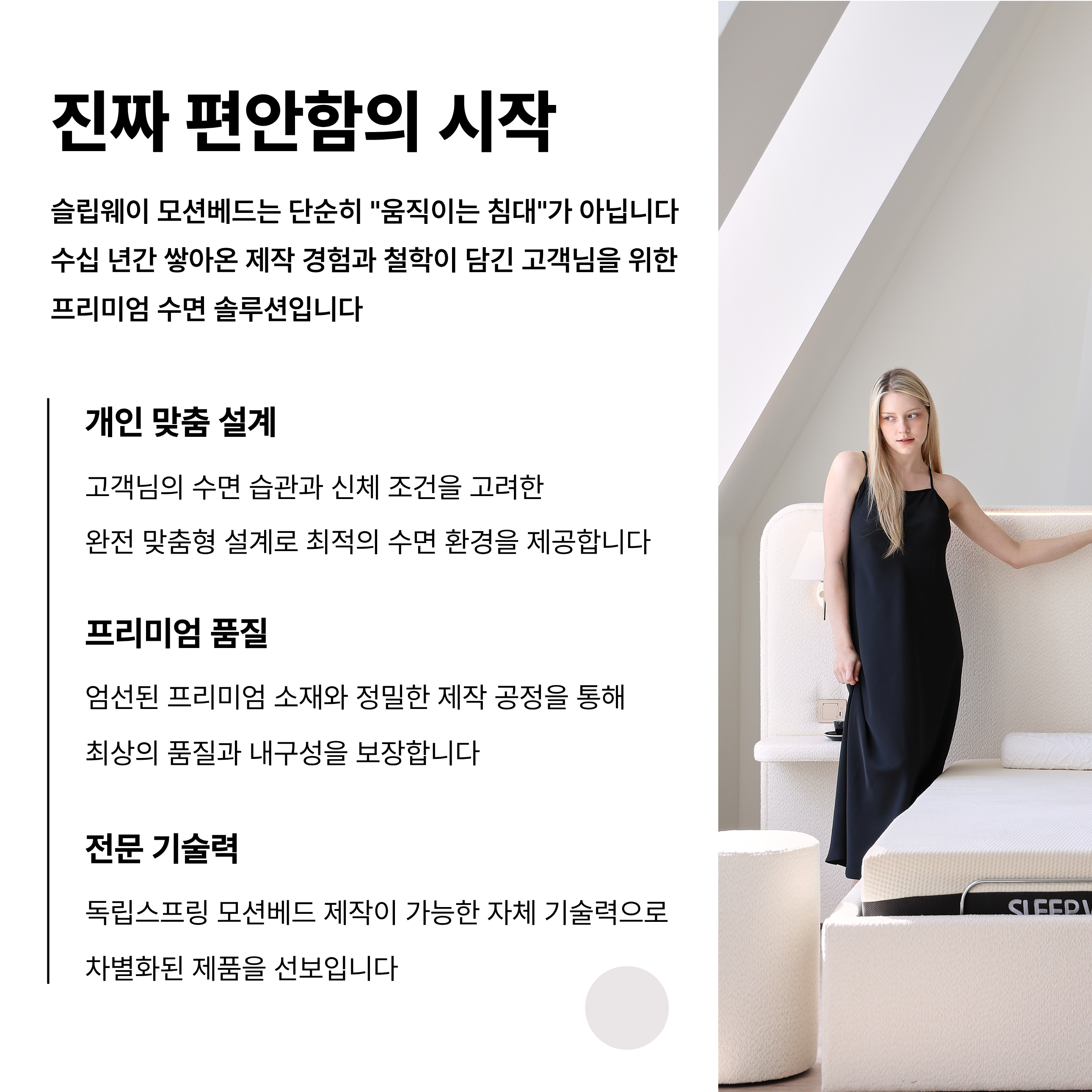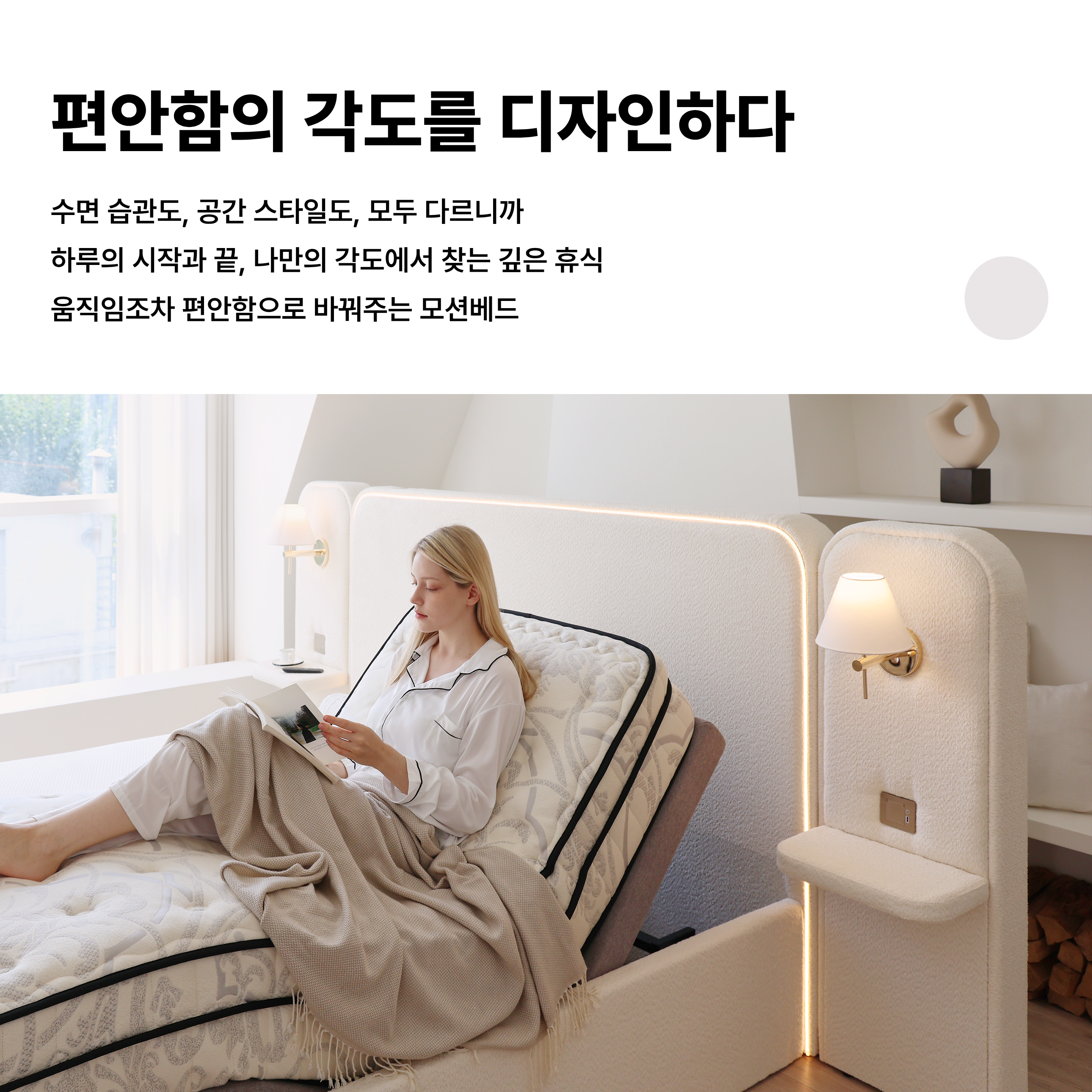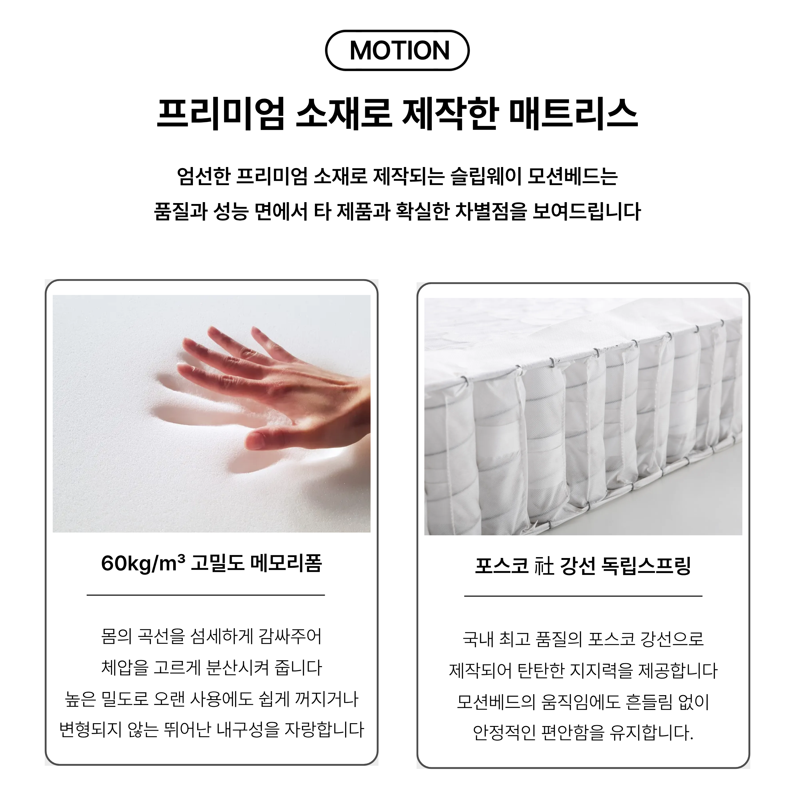 슬립웨이 모션베드는 원하는 각도로 자유롭게 조절해 맞춤형 휴식을 제공하는 프리미엄 베드입니다. 독일 OKIN社의 안정적인 모션 기계와 정밀 가공된 고탄성 베이스폼을 적용해 부드럽고 조용한 구동을 실현하며, 고객의 취향에 따라 독립스프링 또는 메모리폼 타입을 선택할 수 있습니다
