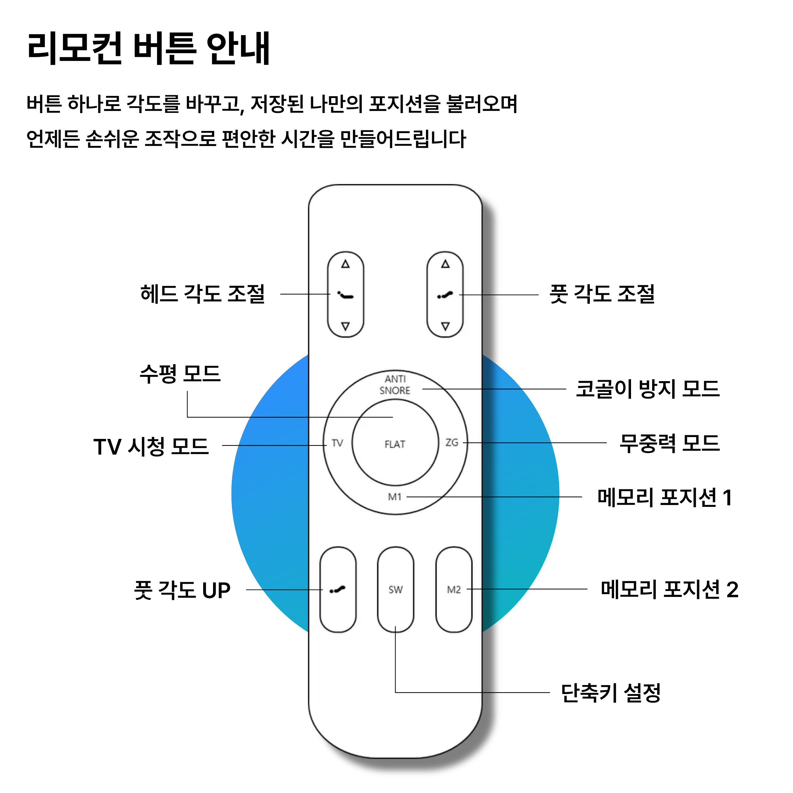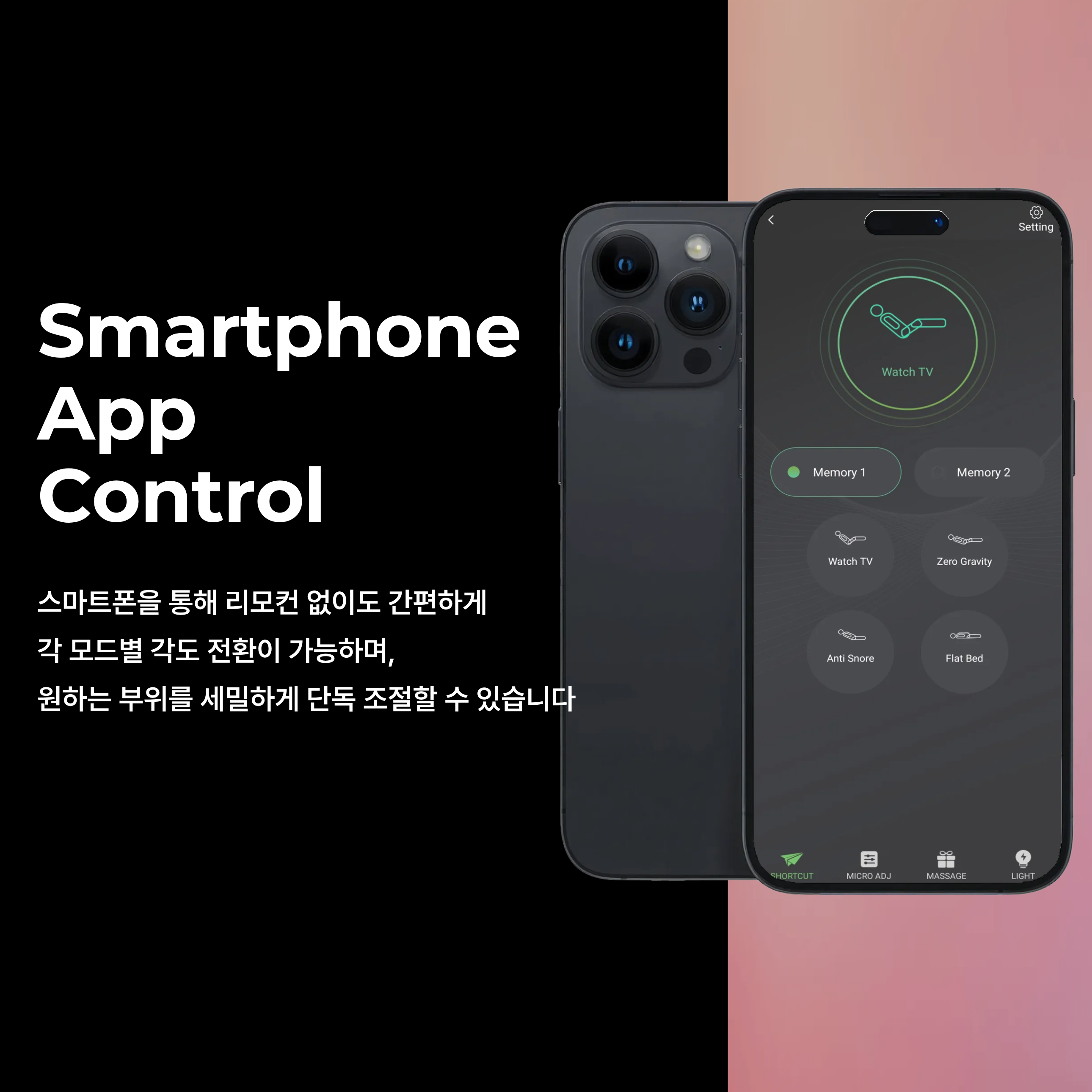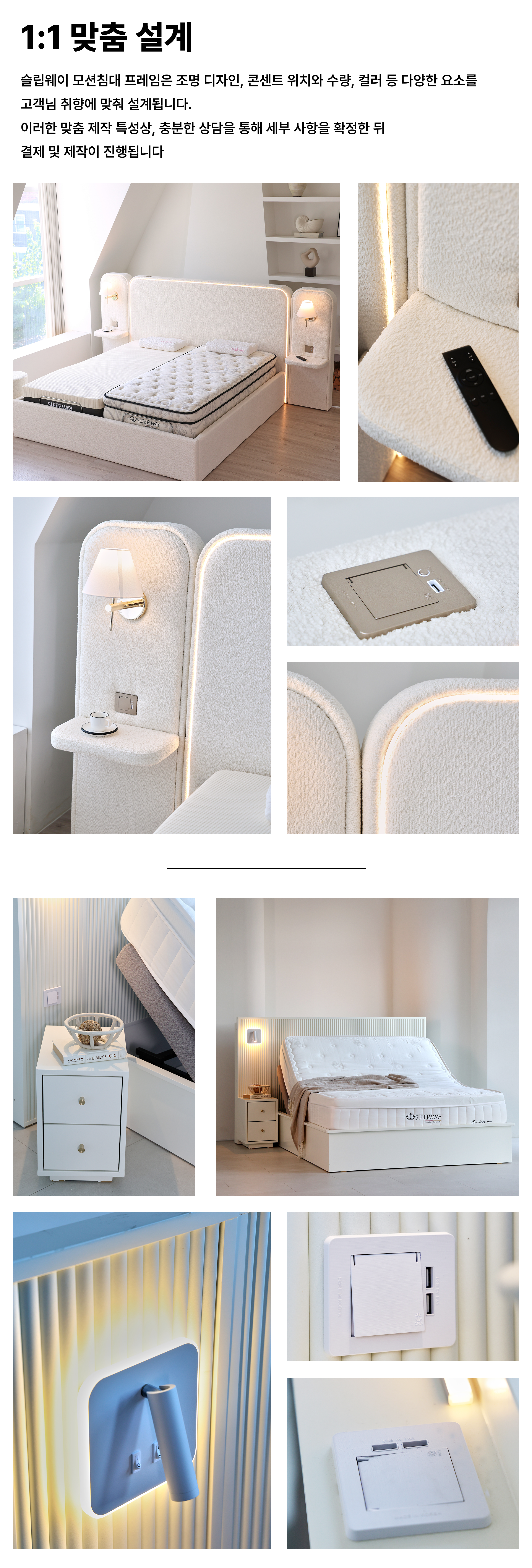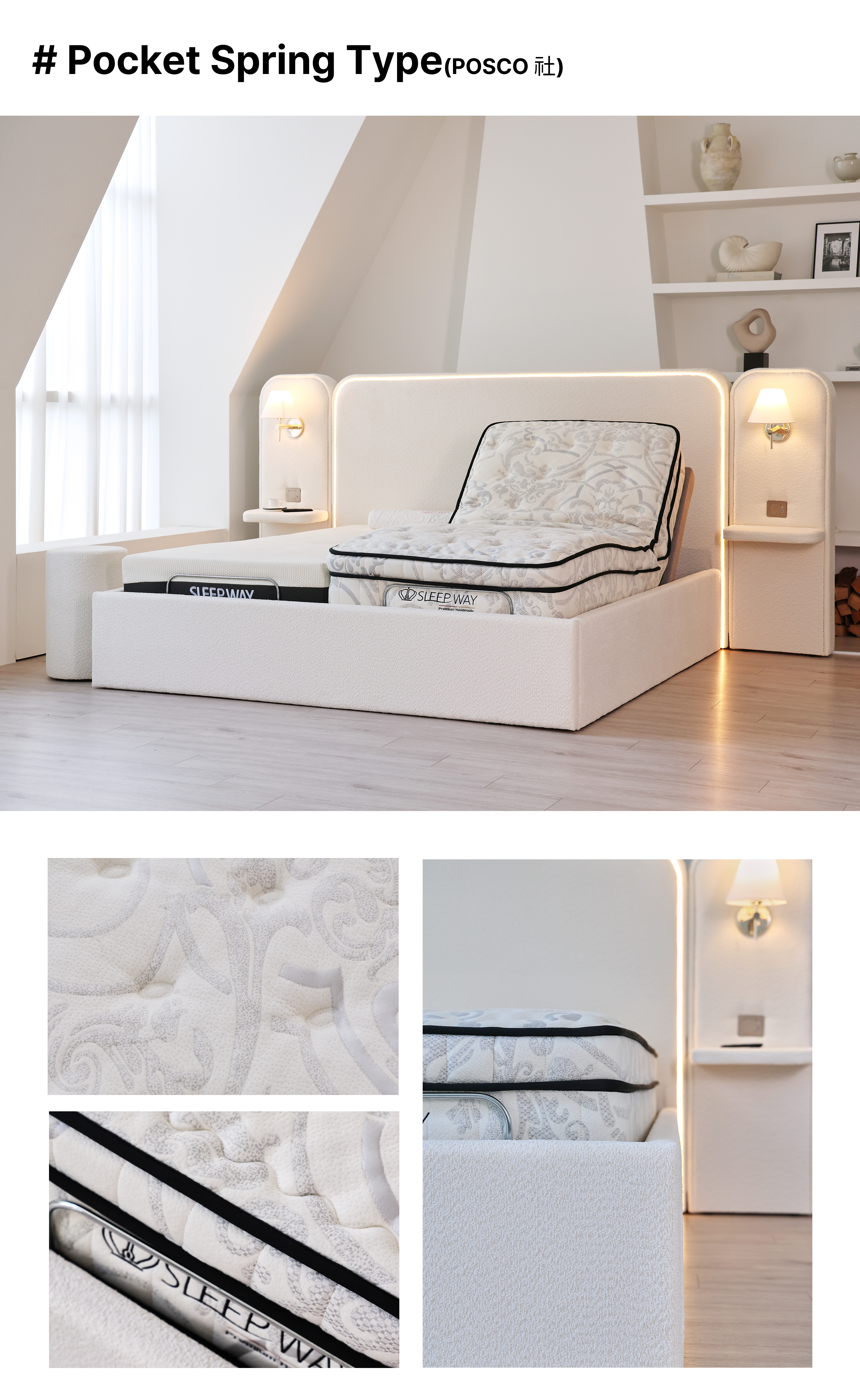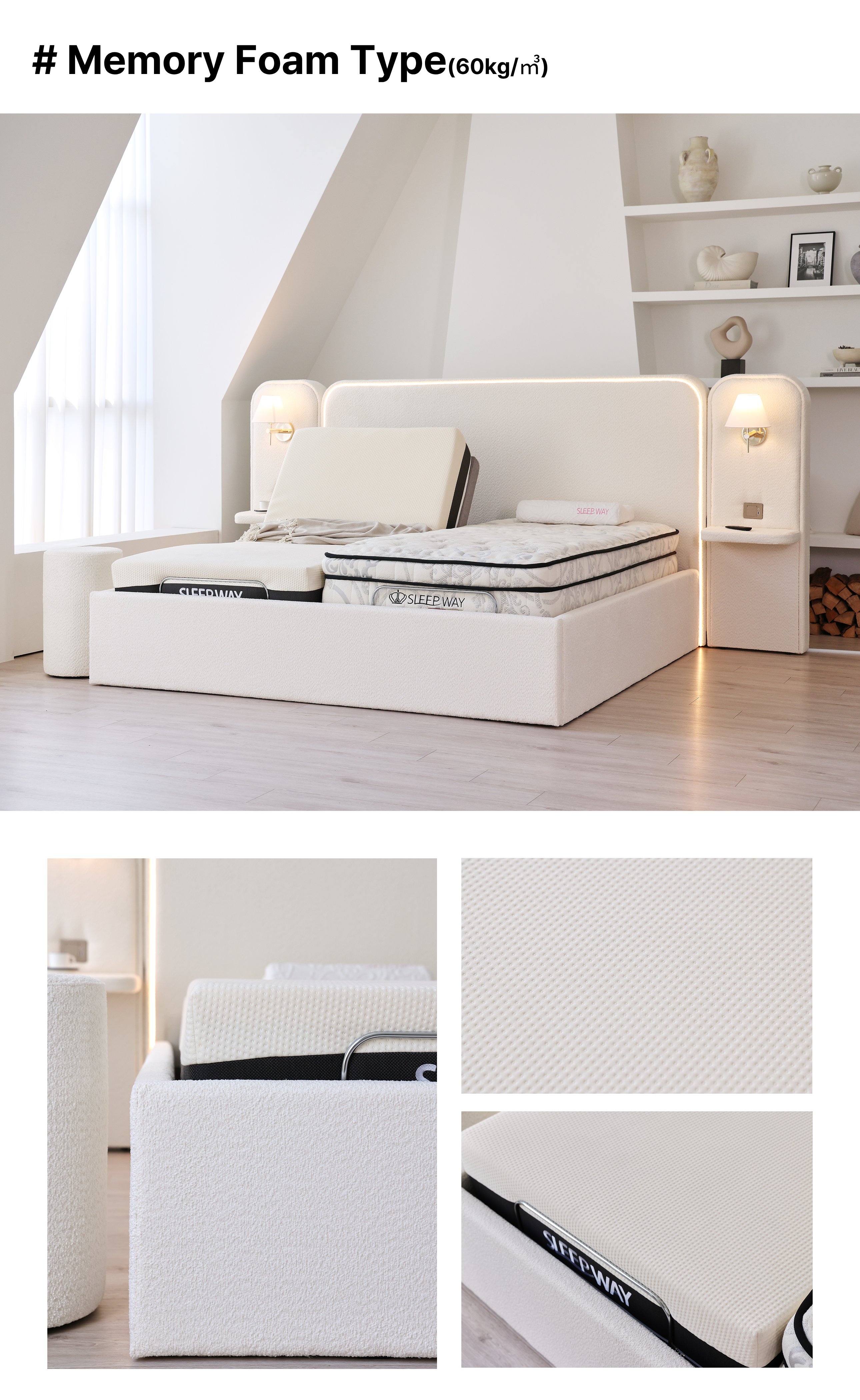 슬립웨이 모션베드는 원하는 각도로 자유롭게 조절해 맞춤형 휴식을 제공하는 프리미엄 베드입니다. 독일 OKIN社의 안정적인 모션 기계와 정밀 가공된 고탄성 베이스폼을 적용해 부드럽고 조용한 구동을 실현하며, 고객의 취향에 따라 독립스프링 또는 메모리폼 타입을 선택할 수 있습니다