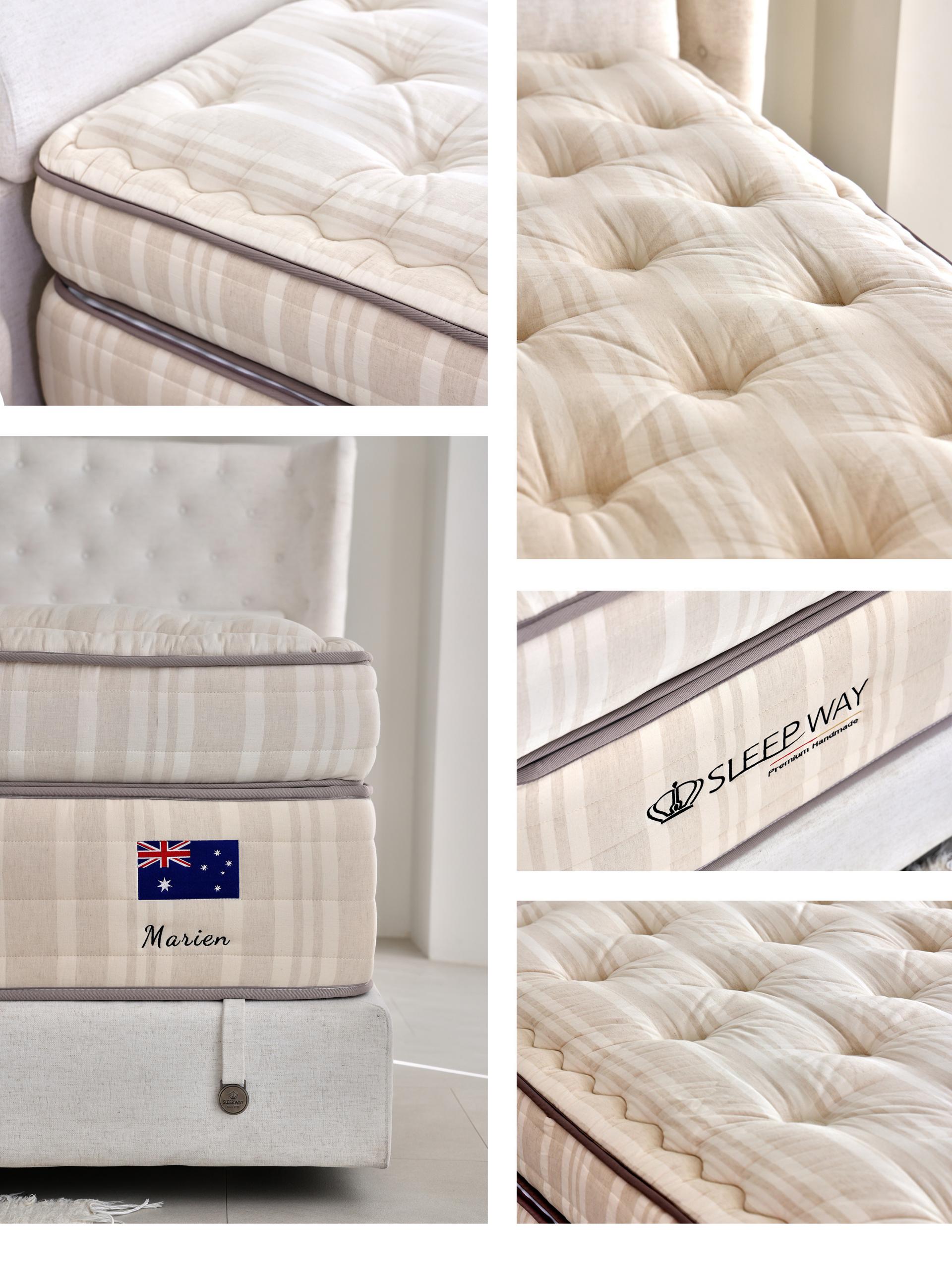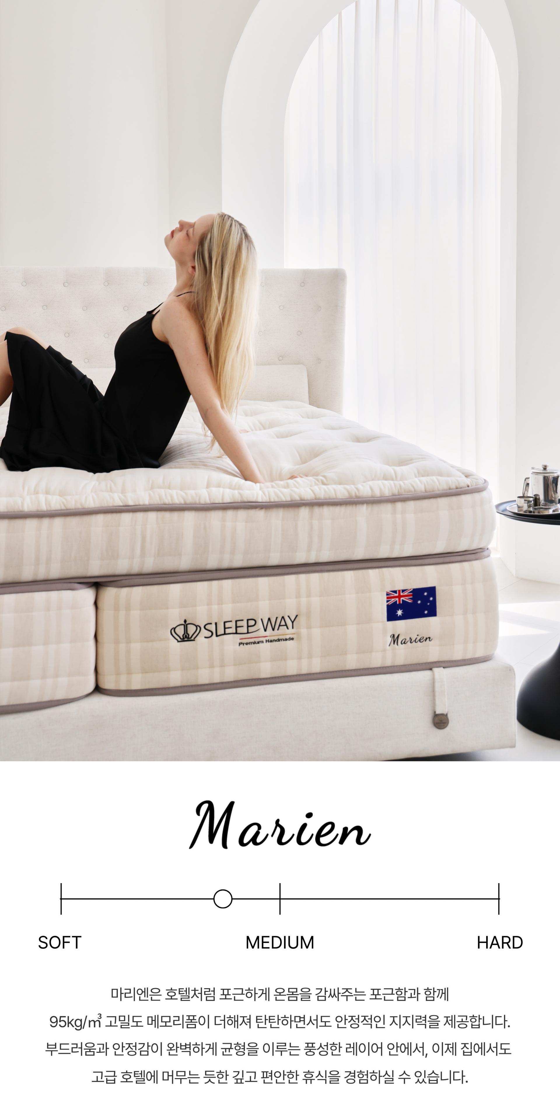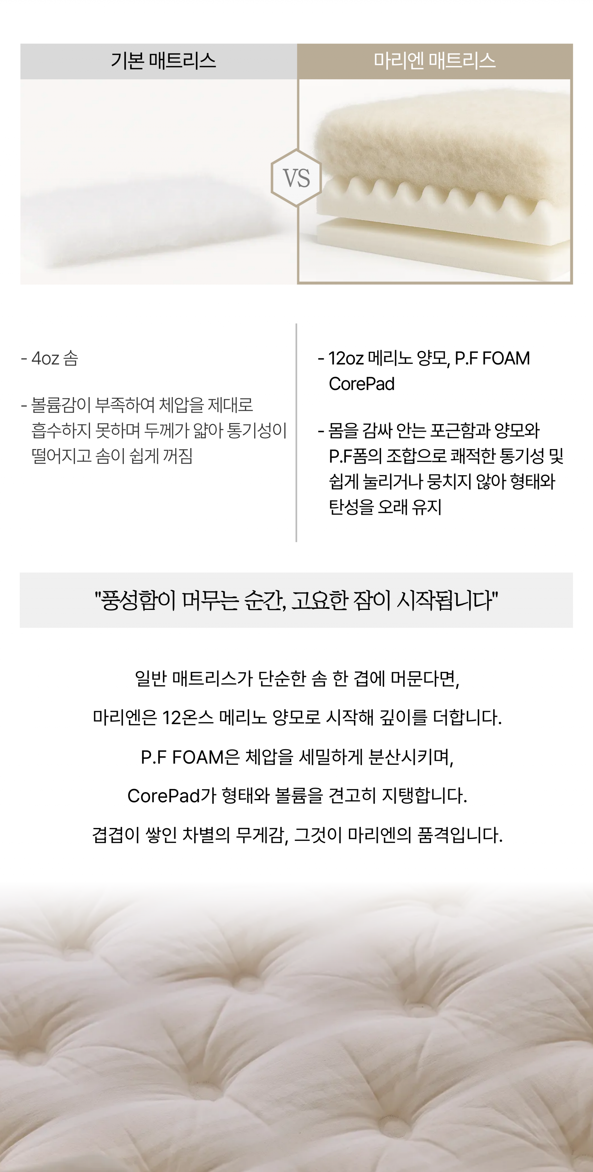 눈으로 보이는 두께와 몸으로 느껴지는 편안함이 새로운 수면 기준을 제시합니다.호주산 메리노 양모 16oz가 더해져 완성되는 깊은 포근함,당신의 침실을 완성하는 단 하나의 하이엔드 매트리스, 마리엔.