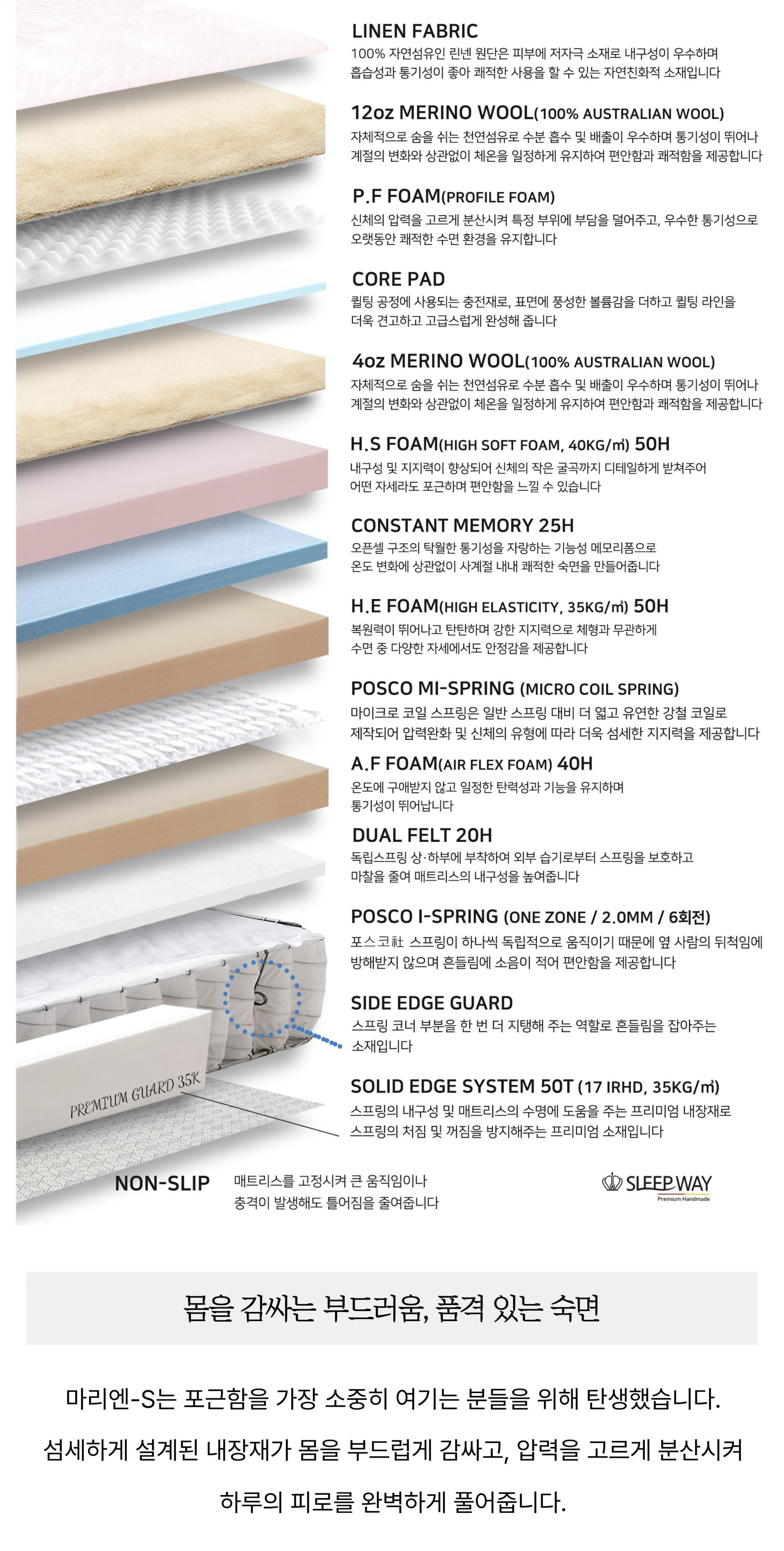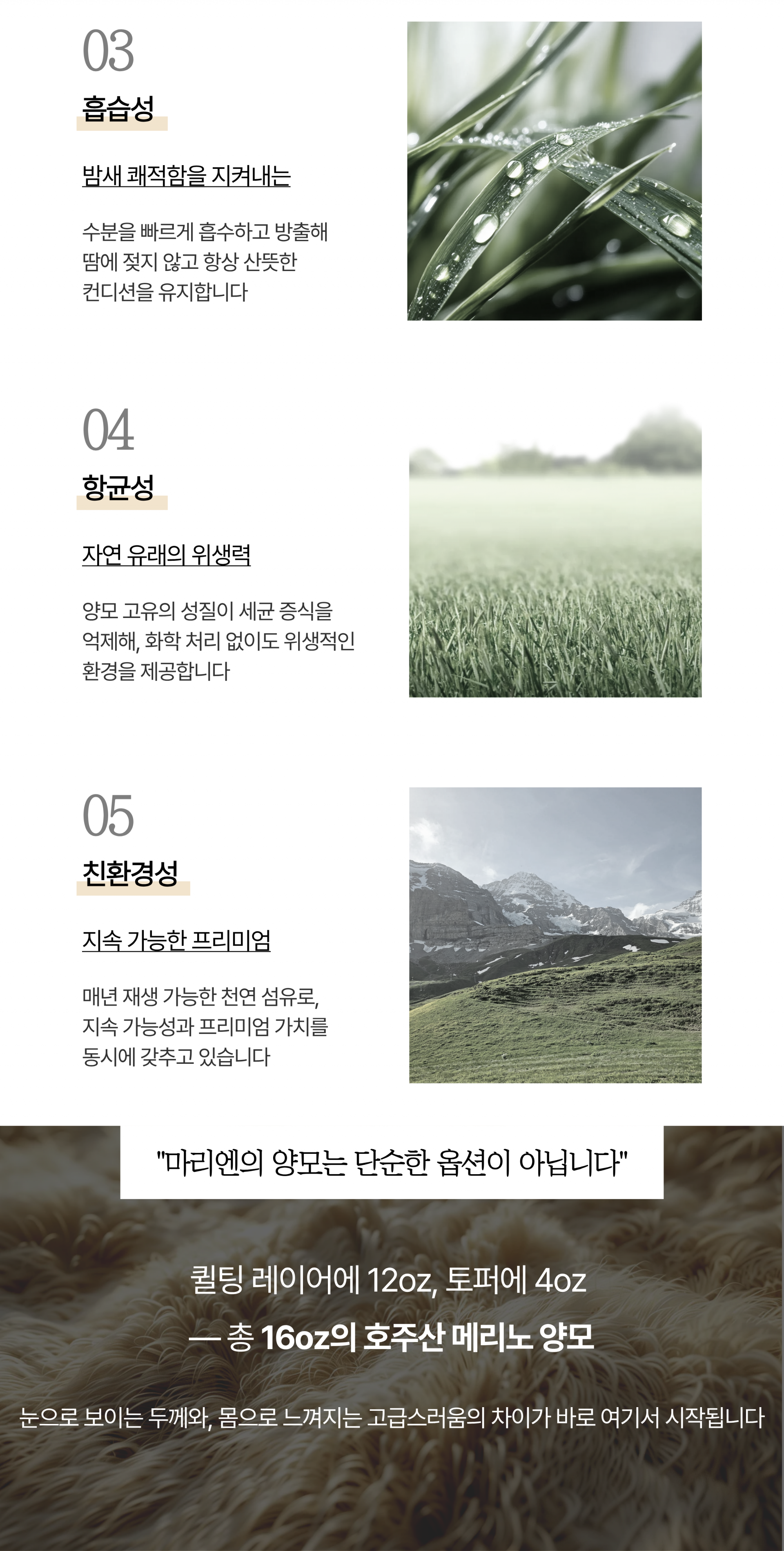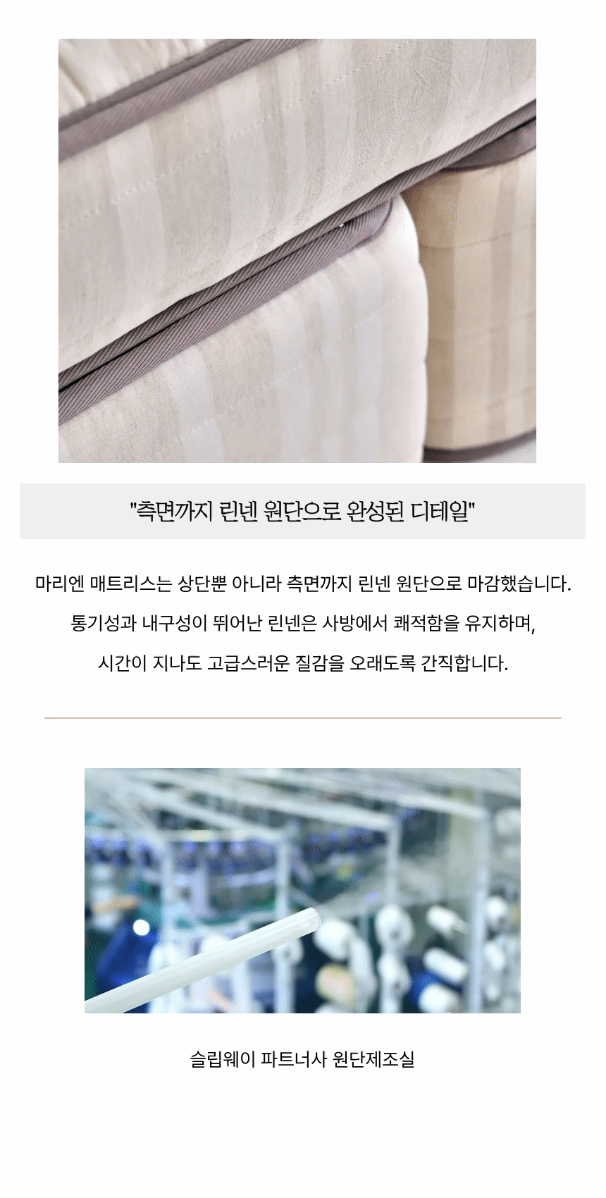 눈으로 보이는 두께와 몸으로 느껴지는 편안함이 새로운 수면 기준을 제시합니다.호주산 메리노 양모 16oz가 더해져 완성되는 깊은 포근함,당신의 침실을 완성하는 단 하나의 하이엔드 매트리스, 마리엔.